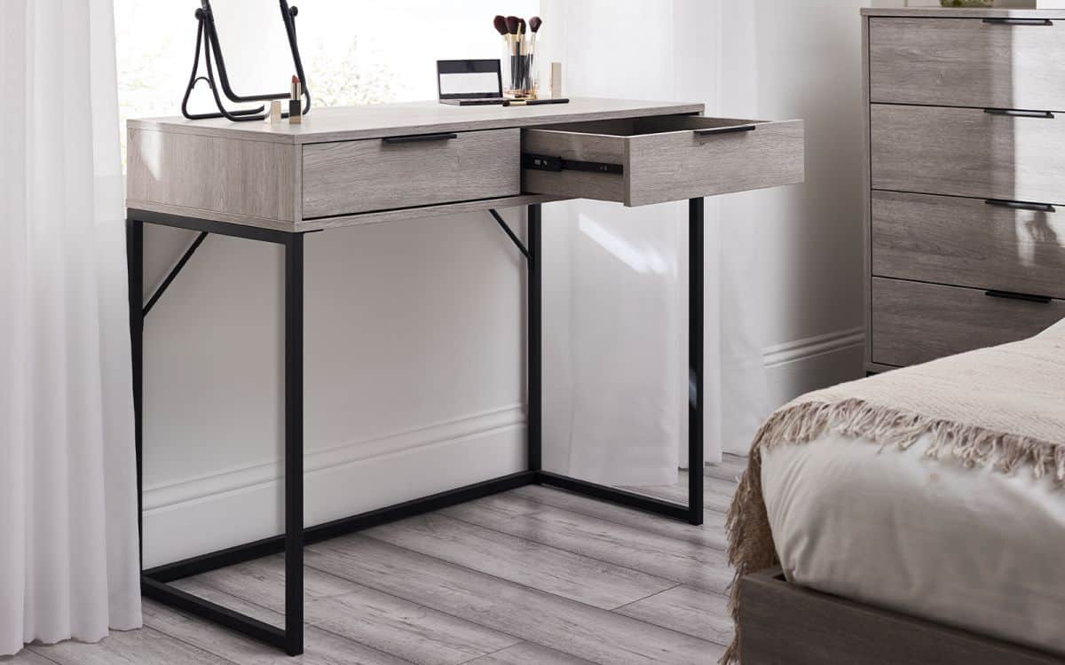 The Batu Dressing Table is sure to elevate your morning routine or home working experience. Finished in a gorgeous grey oak effect with a black metal frame, it incorporates the industrial style of furniture that is always on trend. The hard-wearing top surface is perfect for a variety of uses and it features two storage drawers for cosmetic or stationary storage.
