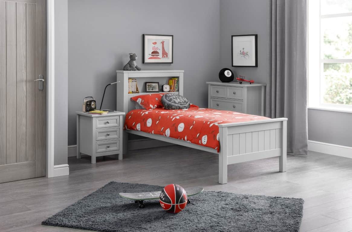 The Braid Bookcase Bed is part of the brilliant Braid Bedroom Collection, which consists of beautiful pieces of elegant New England style furniture that will suit all kinds of bedroom décor and is available in two finishes: Dove Grey or Surf White. It's the perfect addition for a child's bedroom or a guest bedroom, expanding on your bedroom storage with it's innovative design - a bookshelf built into the headboard. It's understated yet elegant appearance allows it to blend beautifully with a variety of bedroom décor, with a timeless panelled design on the foot end. it's been constructed from solid pine and MDF, which makes for a strong and sturdy structure that keeps the bed feeling solid and sturdy throughout use. Additionally, this bedframe also has solid slats, which helps to prolong mattress life and provides incredible support - perfect for both practicality and for style! You can also find a version with an under-bed trundle for an additional sleeping surface.