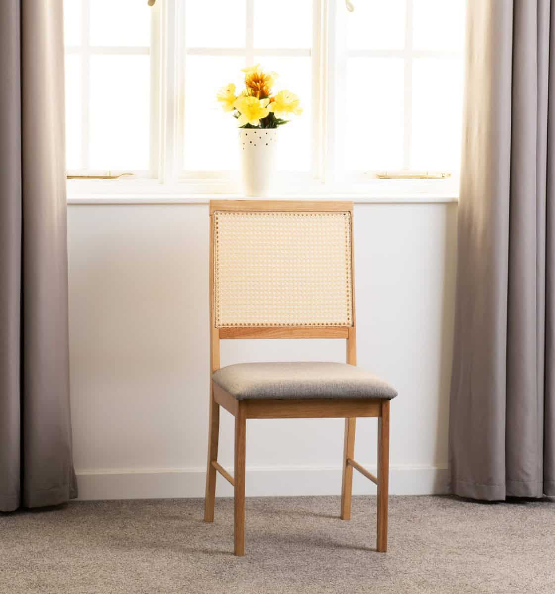 The Ellis Dining Chair is perfect for a wide range of different décor themes, with a no fuss appearance that will withstand the test of time. It's been constructed from strong and solid materials such as rubber wood, fabric and foam that makes for a robust and sturdy structure to provide durability and longevity, helping to keep the chair steady and stable throughout use. The warm oak finish blends effortlessly with any colour scheme and décor theme, brightening up the chair with charm and character to create a timeless appearance. The seat has been upholstered in a smart grey fabric with padding inside to enhance comfort and this chair also boasts a traditional rattan back for a classic, bohemian appeal.