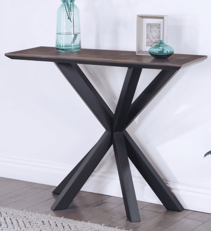 The Nevada Collection is great for modern homes and each piece has been designed to make a bold statement in your home, bringing a sense of contemporary charm to your dining room, living room and more. It's been constructed from strong and solid materials that makes for a robust and sturdy structure that adds durability and longevity to the pieces; including the top surfaces of the tables, which are extremely hard-wearing and resistant to many forms of external damage. It boasts a rich dark parquet wood finish that has a sophisticated appearance but still adds warmth and character into your home space, complimented by black metal frames and geometric bases. This console table will work especially well in a modern front hallway, looking best sitting beneath a wall mirror by your front door. It also makes for a beautiful decorative surface.