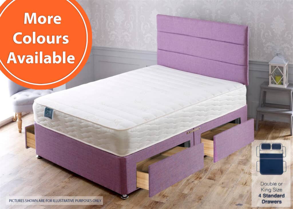 This bed comes as a standard divan bed with FOUR DRAWERS. The base has been constructed from solid and strong materials and timber for a robust and sturdy structure that adds reliability and durability. The base has been upholstered in a high quality fabric of your choice that keeps the base looking fresher for longer and adds a touch of style to the divan. Headboard and accessories not included in the price but may be purchased if you wish. You can find our range of Apollo headboards in our headboard section. This base comes with FOUR DRAWERS, placed two on each side one at the top and the other at the bottom of the base but a non-drawer and a two drawer version can be found on the website. This divan base is delivered in two halves.