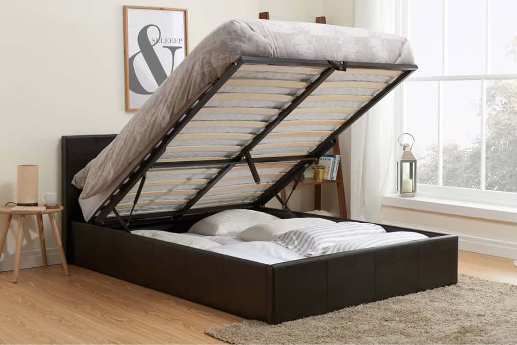 The Berlin Bedframe is a classic design that compliments a wide range of modern bedroom spaces with it's understated yet elegant contemporary appearance. It's simplicity is contrasted by luxurious upholstery, creating a versatile look that is sure to stand the test of time. It's been constructed from a solid hardwood frame which makes for a sturdy and robust structure that not only ensures durability but also keeps the bedframe feeling solid and stable throughout use, minimizing motion disturbance throughout the night. The bedframe has been upholstered in a modern black faux leather fabric for an on-trend appearance, making a sophisticated statement as a centre piece in any bedroom. it has a plain and simple tall headboard with a low foot end - which opens up the bedframe and gives the illusion of more bed space and allows the bed to be admired from all angles. The two combined make this bedframe a great option for those who prefer a more minimalist style. It has dark wooden feet, which adds both style and a touch of sophistication and this bedframe has been finished with a sprung slatted base with a natural bounce, adjusting to where pressure is most exerted for greater comfort and gives you extra support. This bed also has a practical lift up ottoman base to enhance your bedroom storage, constructed from light wood. It's quick and simple to use and is perfect for storing clothing, spare linen, blankets and other light items.