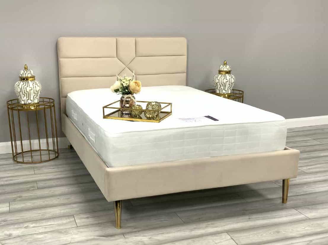 The Brooke Bedframe brings a touch of retro-inspired elegance to any bedroom, blending traditional and classic design elements for a timeless look. Its versatile style allows it to complement a wide range of décor themes, making it a standout centerpiece in both modern and classic interiors. Constructed from solid, durable materials, the Brooke offers a robust and sturdy structure built to last. The stable frame minimizes motion disturbance, ensuring a comfortable and restful night’s sleep. Upholstered in plush velvet, the bedframe adds a luxurious, soft-touch feel while enhancing its sophisticated appeal. The striking geometric design of the headboard gives the Brooke its distinctive retro edge, while the low foot end opens up the sleeping area, creating the illusion of a larger space. Completing the look, elegant brushed gold feet add a touch of glamour and refinement. With its combination of luxurious fabric, retro-inspired design, and durable craftsmanship, the Brooke Bedframe is a stylish and lasting addition to any bedroom.