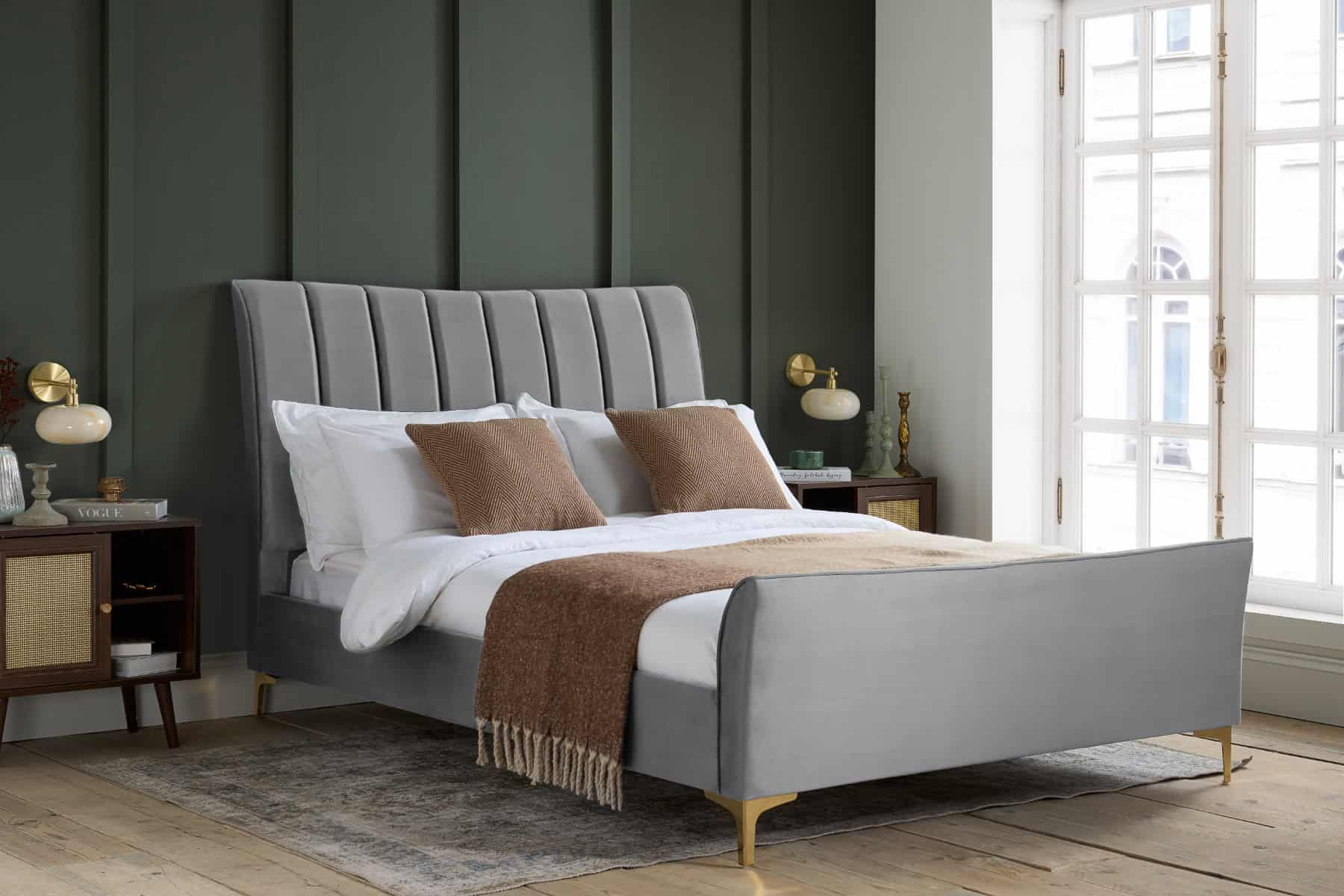 The Clover Bed is a stunning statement piece that blends classic detailing with contemporary style. Upholstered in plush grey velvet, it brings a sophisticated and versatile touch that complements a wide range of bedroom décors and colour schemes. Its beautifully shaped, cushioned headboard offers the perfect place to relax, while the pleated detailing and mid-height foot end add a touch of sleigh-bed elegance. Finished with striking gold feet, the Clover is designed to be a true focal point in any bedroom. Built with a solid hardwood frame, this bed offers exceptional durability and stability, helping to minimise motion disturbance for a restful night’s sleep. The sprung slatted base, sunken into the frame, provides natural bounce and adapts to pressure points for enhanced comfort. The Clover Bed isn’t just furniture, it’s a bold yet timeless centrepiece that combines luxury, comfort, and quality craftsmanship.