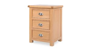 Bring a sense of calm and character to your bedroom with the Newbury range. Finished in a beautiful light oak, each piece showcases subtle attention to detail, including distinctive beading for a touch of traditional texture. Polished silver cup handles add a sleek, contemporary contrast, creating a look that feels both timeless and fresh. The Newbury Bedside Table is the perfect companion for a wide range of bedframe styles, offering practical storage right by your bedside. Featuring three handy drawers, two generously sized and two smaller drawers on smooth wooden rails, it’s ideal for keeping all your night-time essentials organised and within easy reach. Finished with silver cup handles for a touch of sophistication, the spacious top surface also provides the perfect spot for a lamp, alarm clock, books, or decorative accessories.