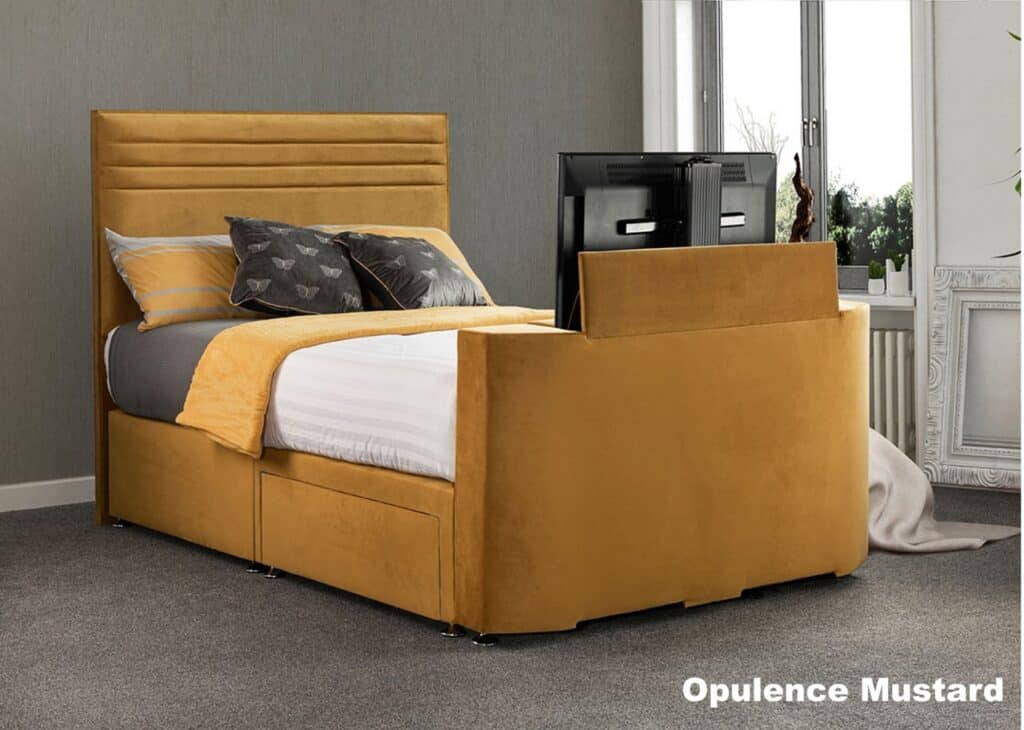 - TV is stored within the footend that rises at the touch of a button; remote included. TV IS NOT INCLUDED IN THE PRICE. TV mechanism must be mains connected.