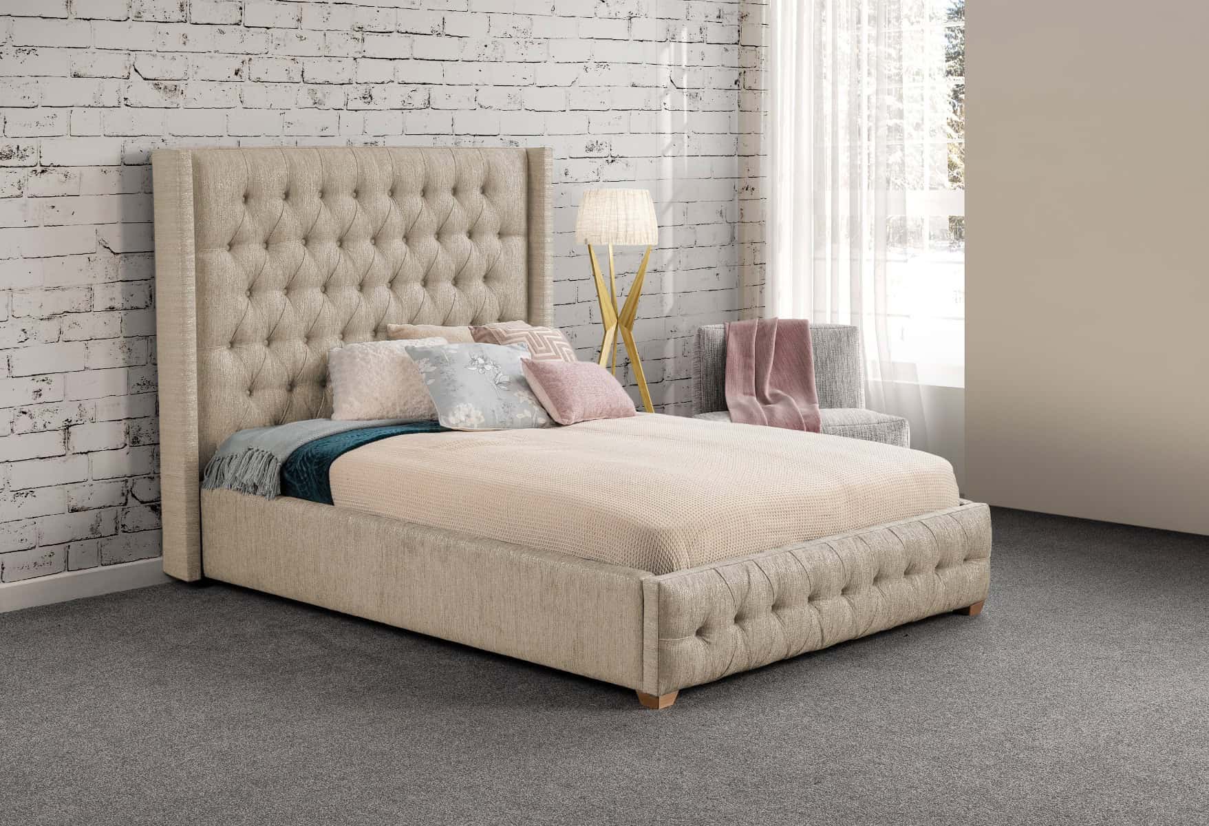 Command attention in your bedroom with the gorgeous Izzy bedframe; a statement bed that is sure to make a striking focal point. It's high fashion design includes a deep buttoned headboard and a matching low foot end, which creates a harmonious look and incorporates a classic design, as well as a subtle winged feature.