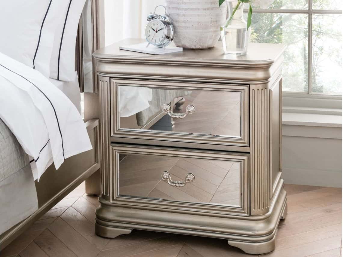 The Jessica Bedside exudes style and luxury, creating a stunning finishing touch in any bedroom. It blends modern features with timeless design to create a versatile appearance that is ideal for anyone who loves a little extra glamour in their bedroom space, keeping your room looking on trend. It's been constructed from solid and strong materials including eucalyptus wood which creates a robust and sturdy structure to add durability and longevity to the bedside, including the top surface which is hard-wearing and resistant to many forms of external damage. The taupe painted finish is complimented by mirrored facing panels that reflect the light around your bedroom, creating a versatile look that will compliment almost any colour scheme and décor theme. It features two drawers to keep all your night time essentials on hand by the comfort of your own bed, finished with neat handles for an added touch.