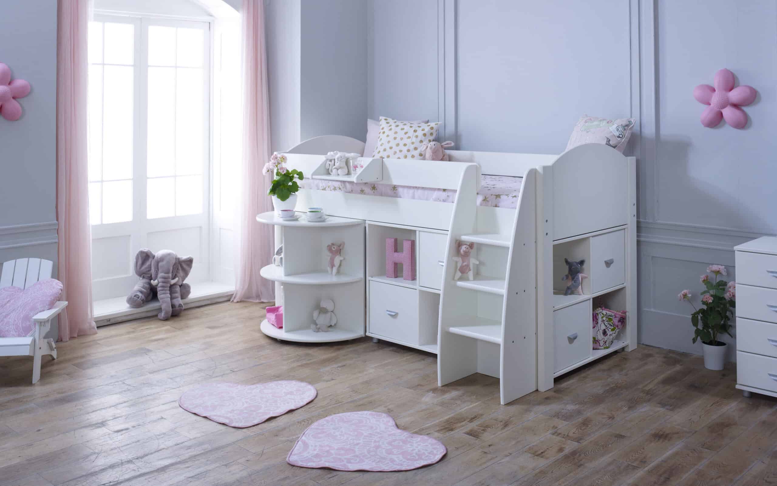 The Kids Avenue Eli G Midsleeper is a sleek and modern design that is suitable for a wide range of children's bedroom décor, suiting both gender neutral and gender specific surroundings. It's contemporary appearance ensures that it lasts through many décor changes, adding a fun and vibrant atmosphere to your child's bedroom. It's been constructed from solid Scandinavian pine and MDF components that makes for a sturdy and robust structure that adds durability and longevity to the midsleeper, helping with motion disturbance throughout the night, with a railing around the sleeping surface to help your child sleep securely - putting both you and your child's mind at ease. It's been finished in a contemporary, clean white colour making it suitable for both gender neutral and gender specific bedrooms. The Eli G has many practical features, combining sleep, storage and study this midsleeper features a pullout desk with bookcase shelving and 2 cube units with 4 doors. The Kids Avenue Eli G desk extends to offer a spacious study area and tucks neatly back under the midsleeper to keep the bedroom floor clear. The bookcase shelving and cube units with doors are perfect for displaying or storing all your little ones bits and pieces to keep their room clutter free.. The attractive Kids Avenue Eli G midsleeper is built with safety in mind, with a sturdy wide ladder for easy to climb steps.