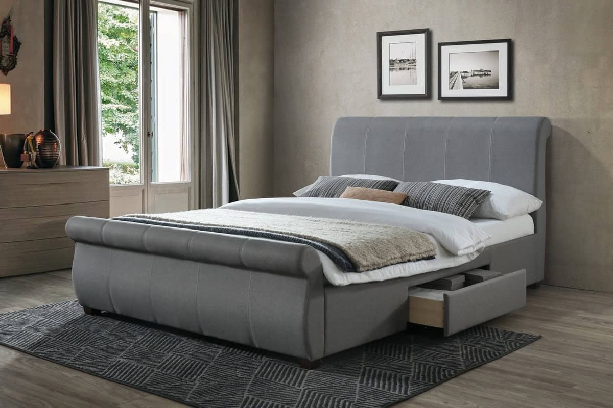 The Lancaster Bed incorporates both classic sophistication and stylish practicality to create a stunning bedroom centre piece, boasting a beautiful modern appeal that makes the bedframe suitable for contemporary spaces. It's been constructed with a solid hardwood frame which makes for a robust and sturdy structure that not only ensures durability and high quality but also keeps the bedframe feeling stable and steady throughout use, minimizing motion disturbance throughout the night. It's been upholstered in a beautiful grey fabric that looks smart and classy, blending effortlessly with a wide range of colour schemes and décor themes and creating a timeless yet modern appearance. It features a rolled headboard and foot end to perfectly bring to life a traditional sleigh bed design, breathing grandeur into your bedroom and also has two spacious drawers built into the base of the bed, perfect for storing clothing, blankets, spare linen and other light items. The Lancaster Bed is finished with a sprung slatted base that offers increased support as it responds to points where pressure is exerted, allowing you to enjoy greater comfort and support as you rest.
