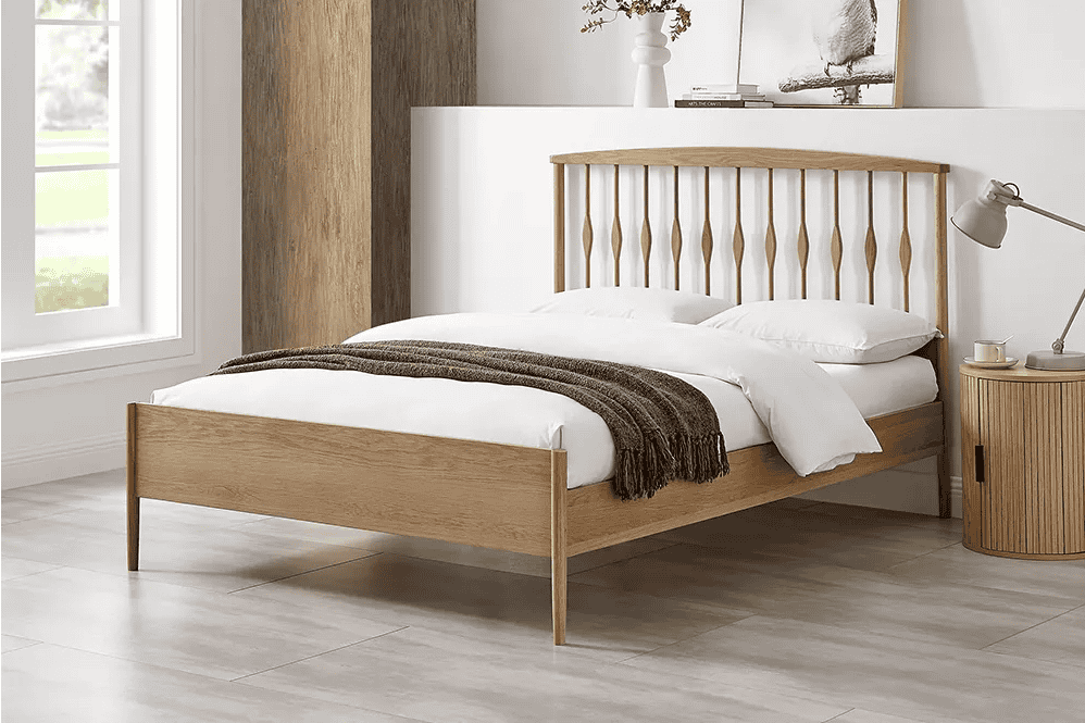 The Juno Bedframe offers a fresh interpretation of a classic design, making it a versatile choice for a wide range of modern bedroom styles. Crafted from solid, high-quality FSC® certified wood, it delivers a durable and sturdy structure that ensures long-lasting performance and stability. This construction helps minimize motion disturbance during the night, promoting a restful sleep. Additionally, the sustainably sourced wood makes it an eco-friendly option. Finished in a warm oak tone, the Juno blends effortlessly with various colour palettes and interior themes, bringing charm and character to any bedroom. The headboard features a timeless spindle design with a low-rise footboard, drawing inspiration from traditional Shaker style and enhanced by square post legs for added definition. The solid slatted base supports better air circulation, promoting mattress longevity and a more comfortable night’s sleep. For added durability, the bedframe is reinforced with hardened steel side rails.