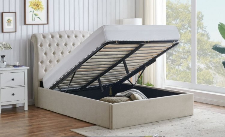 The Rosa Ottoman brings elegance and timeless style to your bedroom, blending seamlessly with both traditional and modern décor. Upholstered in a sumptuous fabric, its soft tone makes it effortlessly versatile, complementing a wide range of colour schemes and interiors. Built from robust, high-quality materials, the Rosa is designed to offer lasting strength and durability. Its solid construction ensures a stable and supportive frame, keeping your bed secure and steady throughout nightly use. At the heart of its design is a striking deep-buttoned headboard with a classic scroll silhouette, paired with a low foot end for a more open, spacious feel. This combination creates a sophisticated yet stylish centrepiece, adding a regal touch to any bedroom setting. The defining feature of the Rosa Ottoman Bedframe is the front-opening base that reveals a spacious area within the base for you to put your clothing, spare linen, throw pillows and more, making it ideal for smaller bedrooms by enhancing your bedroom storage available without taking up any extra room. The ottoman base is lifted with gas-powered pistons, making lift-up easy and smooth. A reliable flat slat base completes the design, supporting your mattress, improving airflow, and helping to extend mattress life while offering comfort and peace of mind.