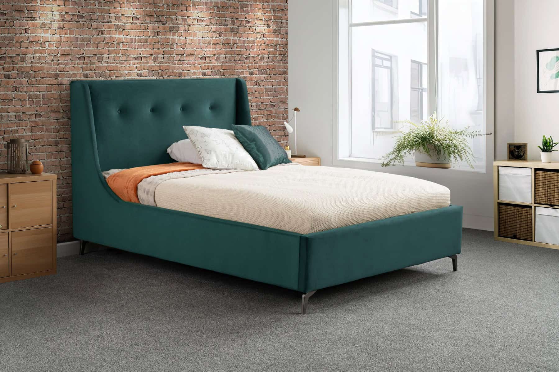 The Sorrel Bedframe will keep your bedroom looking on trend and stylish, boasting a contemporary and sleek design that blends effortlessly into any surrounding. It's subtle yet stylish appearance makes a bold statement and is perfect for minimal styled bedrooms but will look great with almost any modern interior choice. It's been crafted from solid and strong materials such as hardwood, metal and hard-wearing fabric upholstery that makes for a robust and sturdy structure, adding durability and longevity to the bedframe and keeping it stable and steady throughout use, minimizing any potential motion disturbance throughout the night. This bed comes in a choice of fabric in a wide range of colours so there is a choice for every colour scheme, simply choose using the options above to create the perfect bedframe for your individual bedroom (swatches are available in the photos). The headboard features a subtle buttoned design that gives this modern bedframe a small classic twist, with a contemporary take on a traditional winged design to add a timeless charm to the bedframe. The low foot end opens up the sleeping space and provides a more spacious feel around the frame, creating the illusion of a larger space. The angular metal legs tie the look together and a solid slatted base with a one piece shaped side panel provides incredible mattress support and allows for airflow throughout the mattress. The Sorrel Bedframe is available in three sizes; 4ft6, 5ft and 6ft.