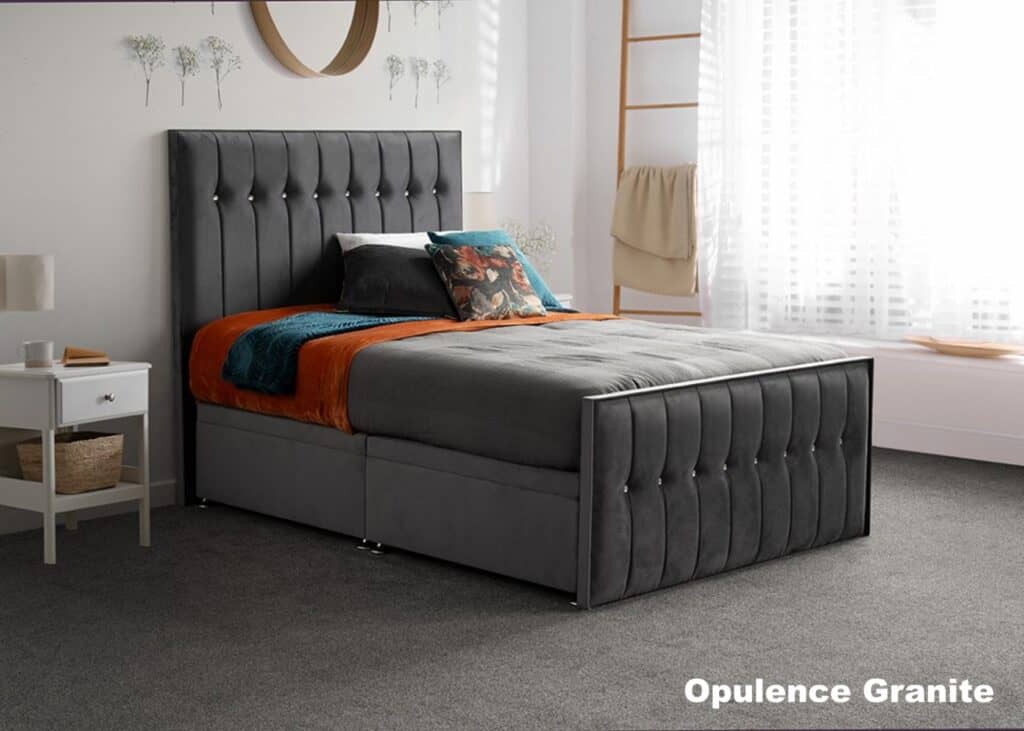 The Style Sparke is an opulent divan / bedframe hybrid that is sure to add a touch of glamour to any bedroom. A brilliant contemporary appearance, it is a luxurious centre piece for the modern space and demands attention. It's been upholstered in a colour and a fabric of your choice. It has a tall headboard that features a beautiful diamante headboard and a matching foot end, which enhances the luxurious appeal of the bedframe, perfect for those with a more glamourous eye.